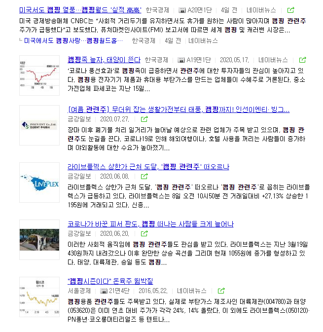 코로나 19의 장기화로 인해 해외여행이 사실상 불가능해졌습니다. 그래서 많은 분들이 국내여행으로 사람과의 접촉이 적은 캠핑을 다니곤 합니다. 그래서 오늘은 캠핑 관련주에 대해 소개해드리겠습니다.