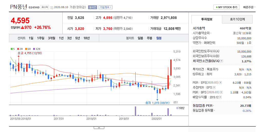 네번째 캠핑 관련주는 PN 풍년입니다. PN 풍년은 주방용품을 주로 생산하는 기업입니다. 압력솥, 프라이팬, 냄비 등 스테인리스나 알루미늄 용품을 생산하고 판매하는데 의외로 캠핑 관련주로 주목을 받고 있습니다.