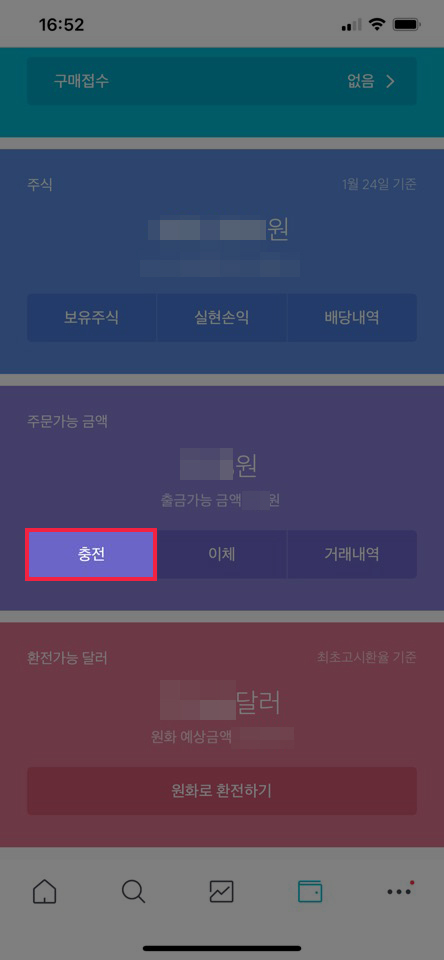 이제 본격적으로 미국 주식 사는 법을 실행해보겠습니다. 먼저 하단에 보이는 메뉴 중 지갑 아이콘을 선택합니다. 그럼 자산현황을 볼 수 있는데 화면에 보이는 여러 가지 카드 형태의 메뉴 중 주문 가능 금액을 확인합니다.