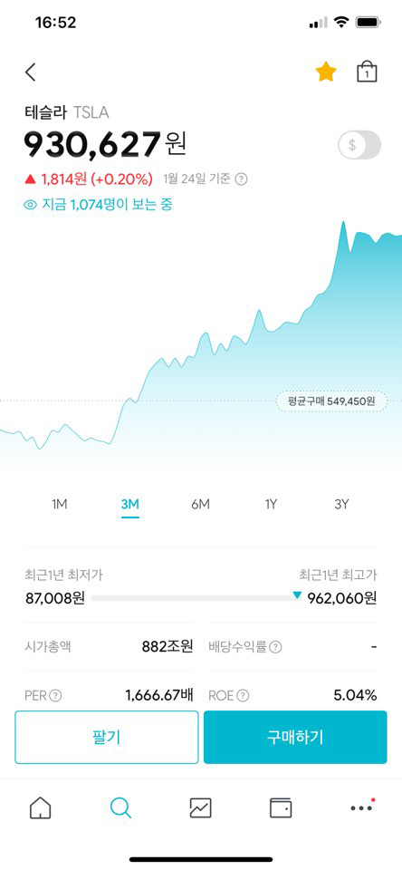 전기차로 엄청난 주목과 동시에 성장하고 있는 테슬라를 검색해보니 검색일 기준 한 주에 93만 원가량으로 평가되고 있습니다. 원화가 아닌 달러라 보고 싶으시다면 가격 우측에 있는 버튼을 통해 변경할 수 있습니다.