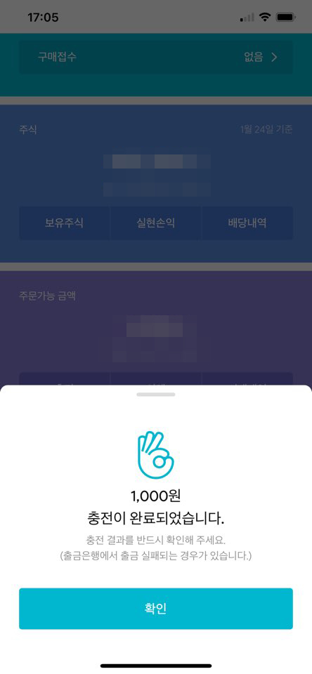 충전 버튼을 클릭하면 주식 구매를 위한 금액을 미니스탁에 충전할 수 있습니다. 카카오뱅크 앱을 통해 가입하셨다면 한국투자증권과 카카오뱅크 앱의 연동으로 간단한 입력만으로 이체할 수 있습니다.