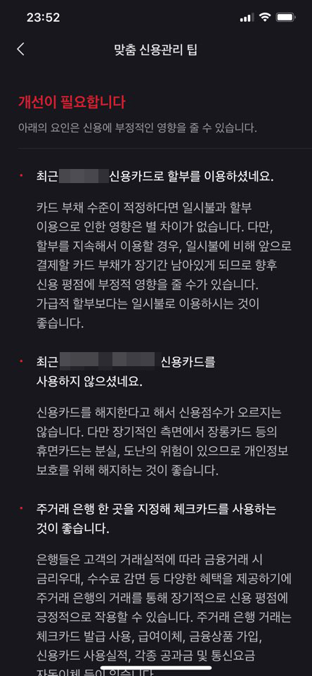 신용점수 올리기를 선택하면 하루 만에 올릴 수 있는 방법을 안내해줍니다. 그리고 맞춤 신용관리 팁을 통해서는 개선해야 할 점과 잘 되고 있는 점을 소개해주고 있습니다.