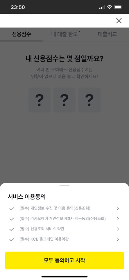 카카오페이 신용점수 조회를 시작한 뒤 간단한 동의 절차를 거치면 결과를 볼 수 있습니다.