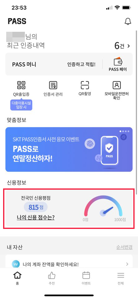 저는 SK의 PASS앱을 사용하여 신용점수 조회를 해봤습니다. 실행화면에서 신용정보 부분을 선택해주세요.