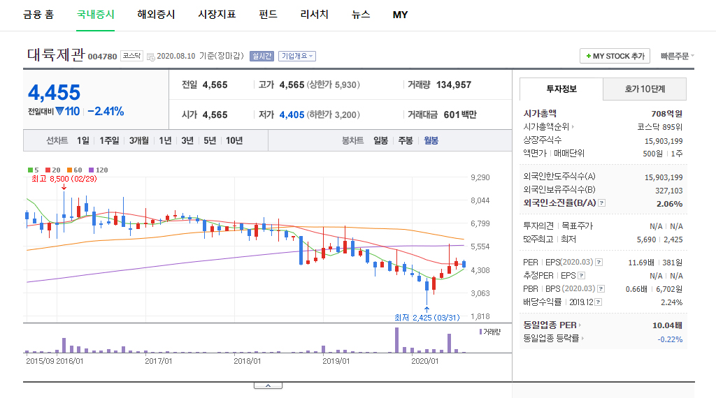 앞서 소개해드린 태양과 마찬가지로 휴대용 연료인 가스를 생산 및 판매하는 대륙제관입니다. 태양에 비해 규모는 적지만 캠핑 열풍으로 인해 휴대용 연료에 대한 수요가 높아지며 주목을 받고 있습니다.