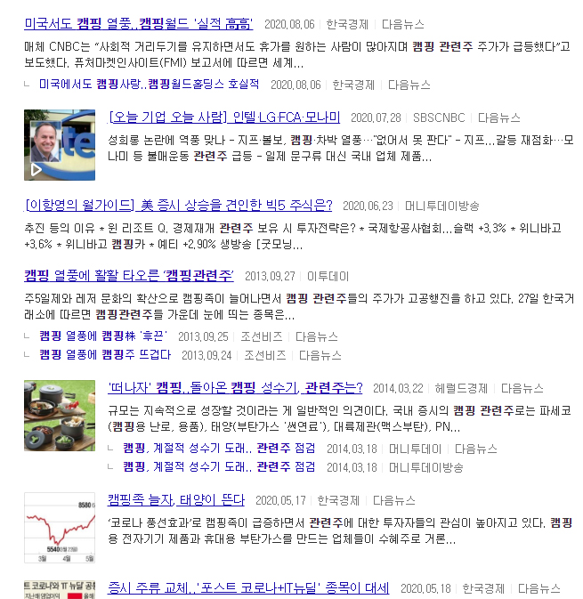 코로나 19의 장기화로 인해 해외여행이 사실상 불가능해졌습니다. 그래서 많은 분들이 국내여행으로 사람과의 접촉이 적은 캠핑을 다니곤 합니다. 그래서 오늘은 캠핑 관련주에 대해 소개해드리겠습니다.