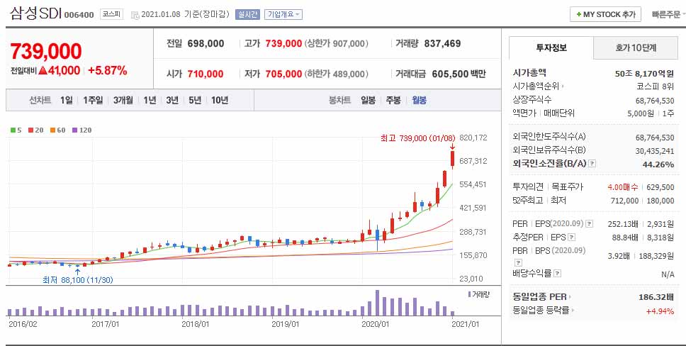 삼성그룹의 계열사인 삼성 SDI는 각종 소형전지와 자동차 전지를 생산 판매하고 있습니다. 또 다른 사업으로는 에너지 솔루션과 반도체 및 디스플레이 소재도 생산 및 판매를 하고 있는데 높은 시장 점유율로 2차 전지 관련주로 관심이 높습니다.