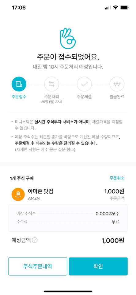 구매를 완료하면 바로 다음 화면에서 주문 접수가 완료되었다는 메시지를 확인할 수 있습니다. 주문 체결은 실시간으로 바로 이루어지는 것이 아니고 다음 미국 증시 개장 시간에 체결이 완료됩니다.
