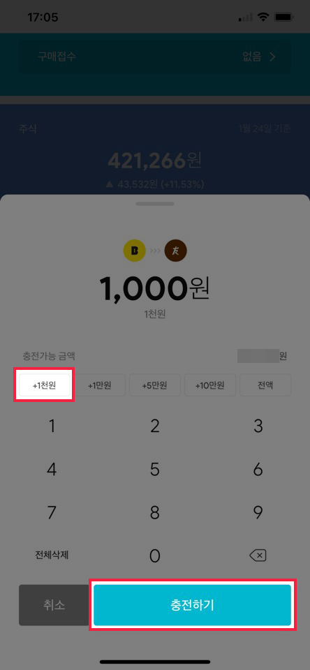 충전 버튼을 클릭하면 주식 구매를 위한 금액을 미니스탁에 충전할 수 있습니다. 카카오뱅크 앱을 통해 가입하셨다면 한국투자증권과 카카오뱅크 앱의 연동으로 간단한 입력만으로 이체할 수 있습니다.