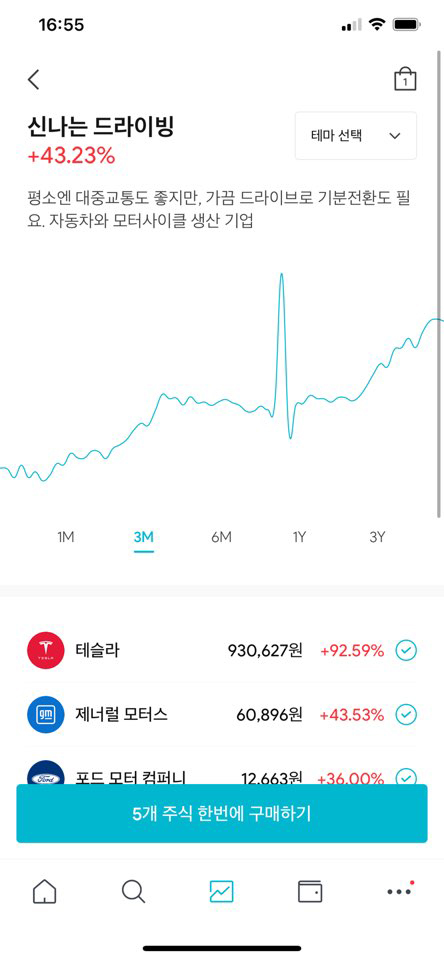 여기서 말하는 테마란 주식 시장에서 쓰이는 테마주가 아닌 관련 산업별로 주목할만한 기업들을 구분한 것입니다. 다양한 산업분야를 구분하고 각 분야를 대표하는 5개 기업을 묶어 보여주고 있는데요. 기간별 수익률까지 쉽게 확인할 수 있습니다.